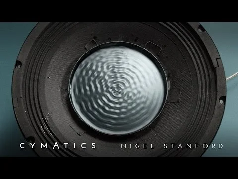 Cymatics, from Greek: κῦμα, meaning "wave", is a subset of modal vibrational phenomena. The term was coined by Hans Jenny(1904-1972), a Swiss follower of the philosophical school known as anthroposophy. Typically the surface of a plate, diaphragm or membrane is vibrated, and regions of maximum and minimum displacement are made visible in a thin coating of particles, paste or liquid.Different patterns emerge in the excitatory medium depending on the geometry of the plate and the driving frequency. --- Wikipediapa
